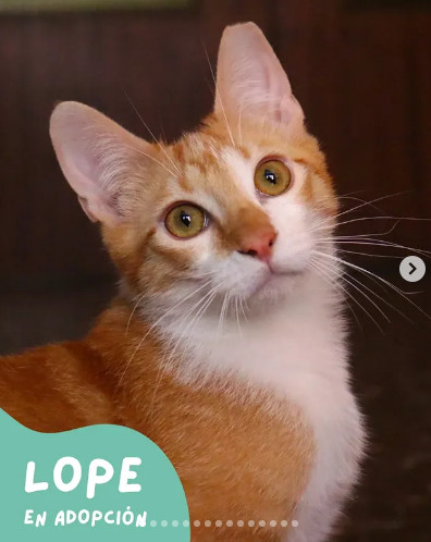 Este guapetón blanco y naranja es Lope, un gato joven, divertido y con muchísima energía. Tiene 1 añito y es un auténtico experto en jugar con la caña: salta, corre, se esconde, ¡y repite sin descanso!